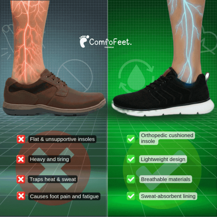 Tired of wearing stiff shoes that lack cushioning and leave your feet aching halfway through the day? ComfoFeet’s Ultra Comfortable Orthopedic Shoes are here to change that. With a wide toe box and superior orthopedic support, our shoes strike the perfect balance between style and comfort. No more foot pain—experience unmatched comfort all day long.